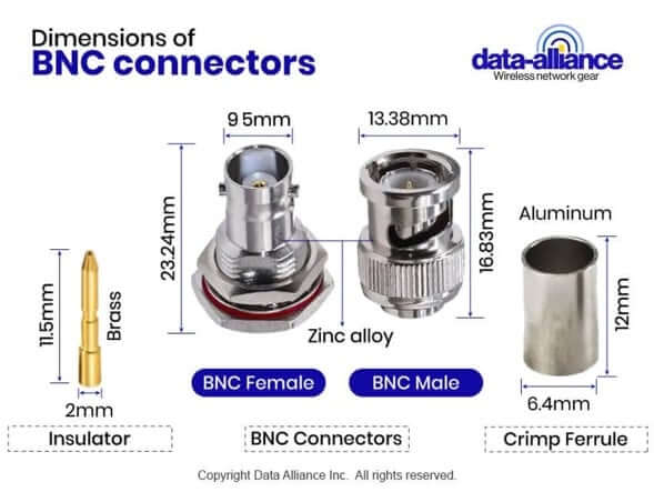 Data Alliance BNC cable assemblies are manufactured using precision 75 Ohm connectors designed specifically for true impedance matching — not modified 50 Ohm versions. This ensures consistent return loss performance across HD-SDI and 3G-SDI bandwidths.