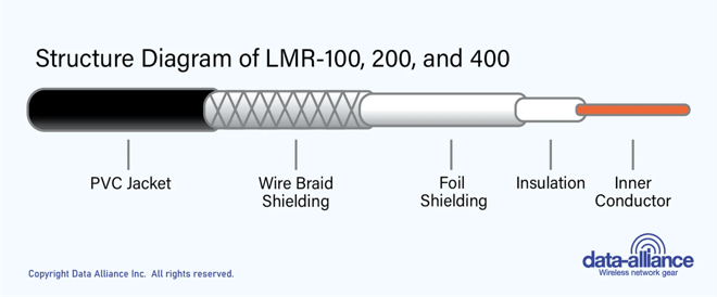 LMR-200 coaxial cable uses a layered construction designed to maintain signal quality and durability.