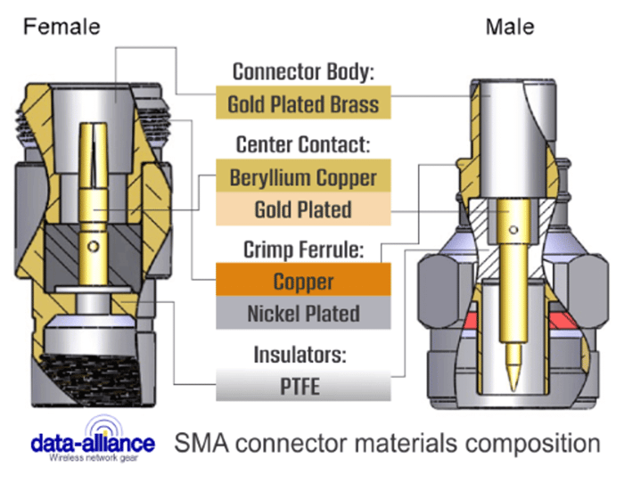 Most SMA connectors used on antenna cables are made with a gold-plated brass body. Gold plating provides excellent conductivity and corrosion resistance and is ideal for indoor applications. - Nickel-plated brass