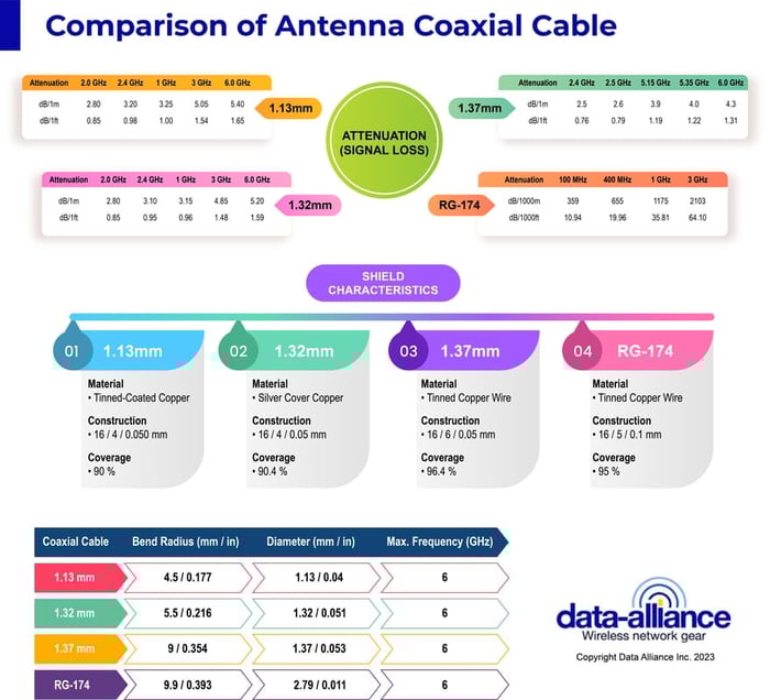 Thicker cables like RG174 have lower attenuation (less signal loss), while thinner cables like 1.13mm have higher attenuation but offer greater flexibility. 1.32mm and 1.37mm cables strike a balance, maintaining strong performance at frequencies up to 6 GHz.