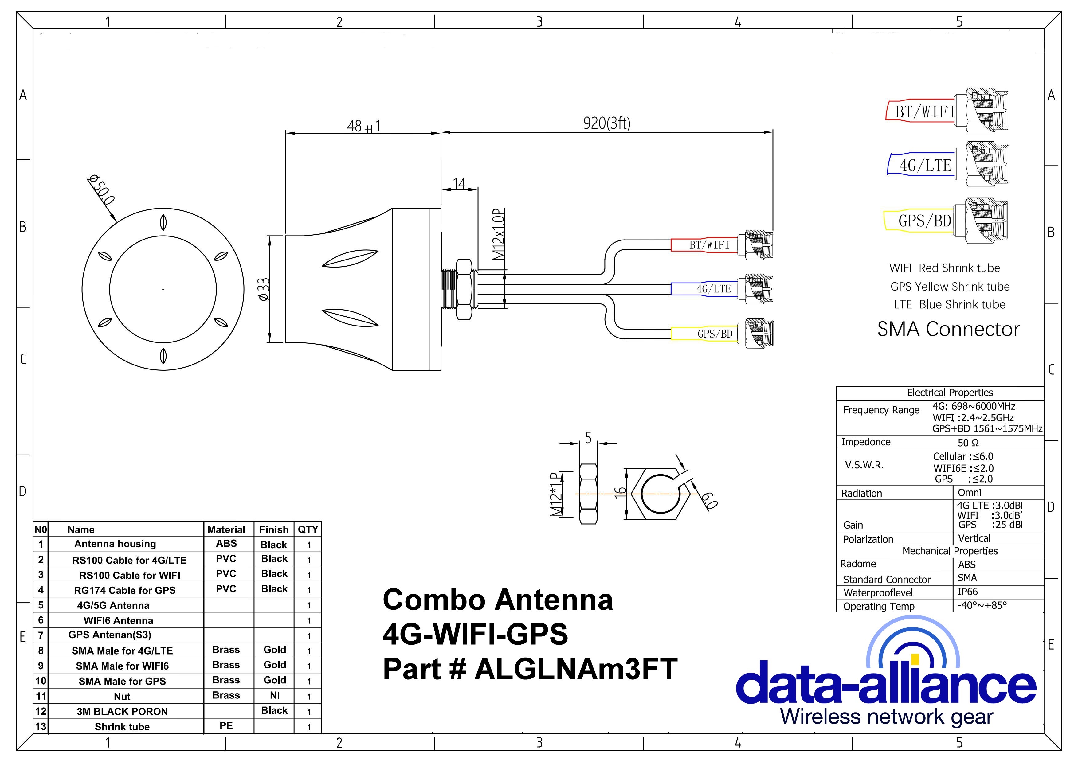 - Two separate cables for LTE and GPS: Both 9-ft cables terminate with SMA-male connectors.