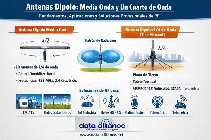 Las antenas dipolo: Media onda y un cuarto de onda son uno de los diseños más fundamentales y utilizados en el mundo de las telecomunicaciones. Gracias a su eficiencia, simplicidad estructural y versatilidad, continúan siendo la base de múltiples sistemas modernos de RF, incluyendo aplicaciones en IoT, redes inalámbricas industriales, radiodifusión, sistemas celulares, enlaces de datos y monitoreo remoto.