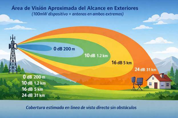 La ganancia en dBi indica qué tan bien una antena concentra la energía de radio en una dirección específica en comparación con una antena isotrópica ideal. Una mayor ganancia no crea más potencia, sino que redistribuye la energía, permitiendo mayor alcance en una dirección determinada.