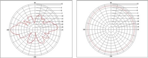 - El diagrama inferior muestra el patrón de radiación de una antena dipolo omnidireccional de 2dBi (con polarización vertical):