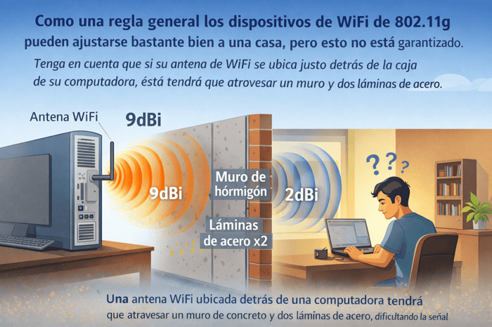 Dicho lo anterior, como una regla general los dispositivos de WiFi de 802.11g, pueden ajustarse bastante bien a una casa, pero esto no está garantizado. Tenga en cuenta que si su antena de WiFi se ubica justo detrás de la caja de su computadora, está tendrá que atravesar un muro y dos láminas de acero.