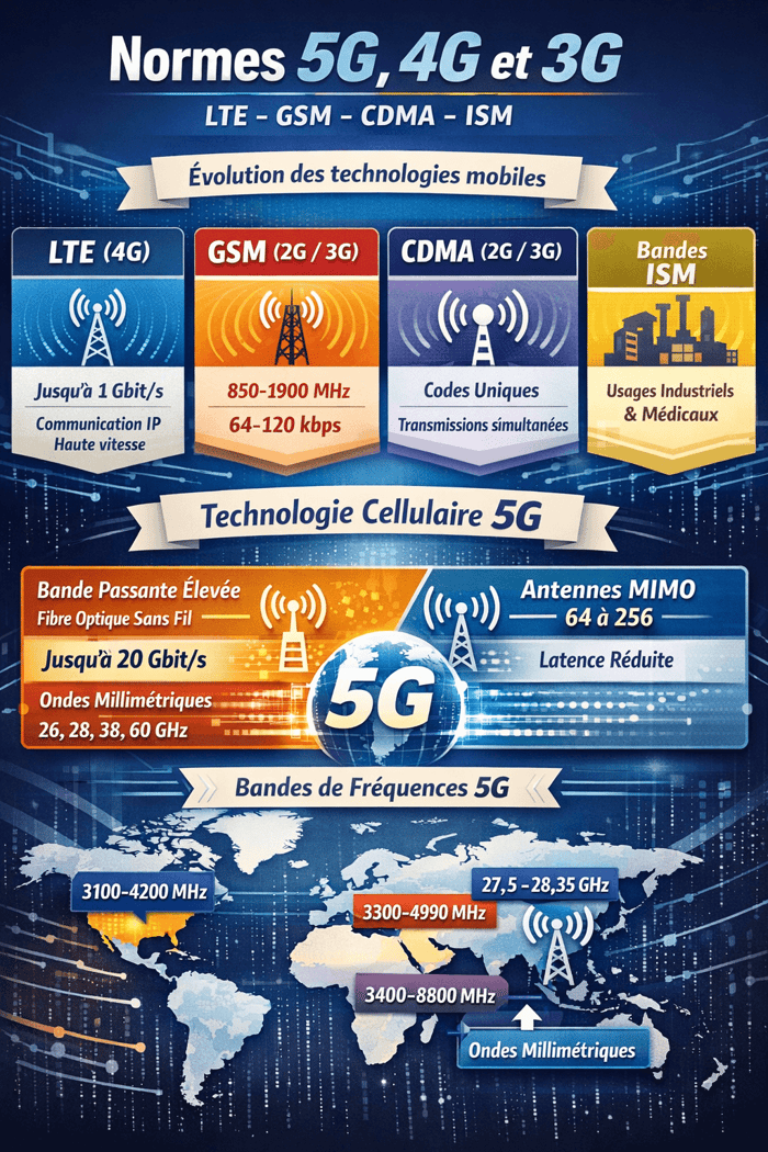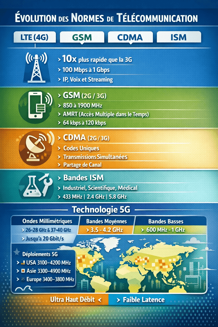 Les normes de communication sans fil telles que LTE (4G), GSM (2G et 3G), CDMA (2G et 3G), 5G et les bandes ISM constituent la base des réseaux de télécommunications modernes. Chacune de ces technologies a été conçue pour répondre à des besoins spécifiques en matière de débit, de latence, de capacité et de couverture.